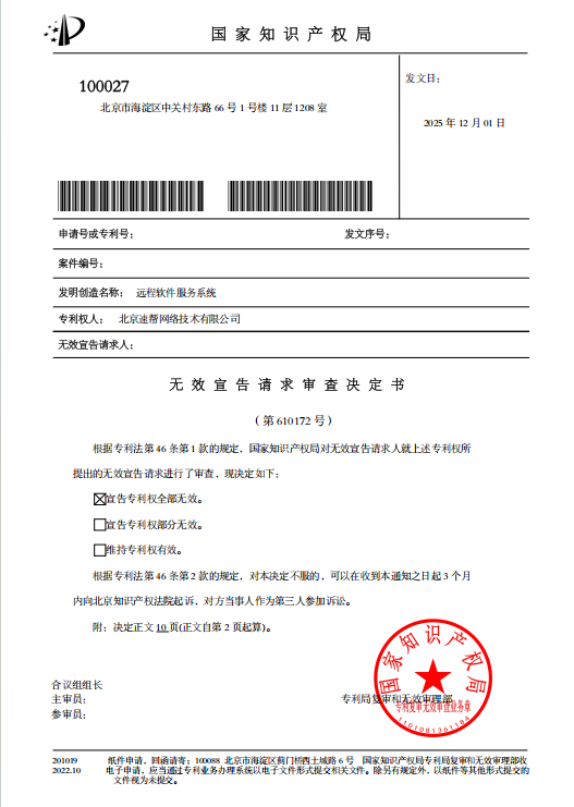 On December 01, 2025, the China National Intellectual Property Administration (CNIPA) issued the Examination Decision on Request for Invalidation No. 610172, declaring that the patent rights of Beijing Subang Network Technology Co., Ltd., titled “Elevator Intelligent Group Control System and Allocation Method” are entirely invalid.