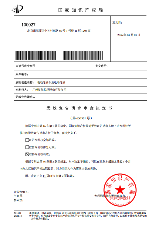 On April 3, 2026, the China National Intellectual Property Administration (CNIPA) issued Invalidation Decision No. 6305614, ruling to maintain the validity of the utility model patent for "Electric Toothbrush Head and Electric Toothbrush" owned by Guangzhou Starjoy Technology Co., Ltd.